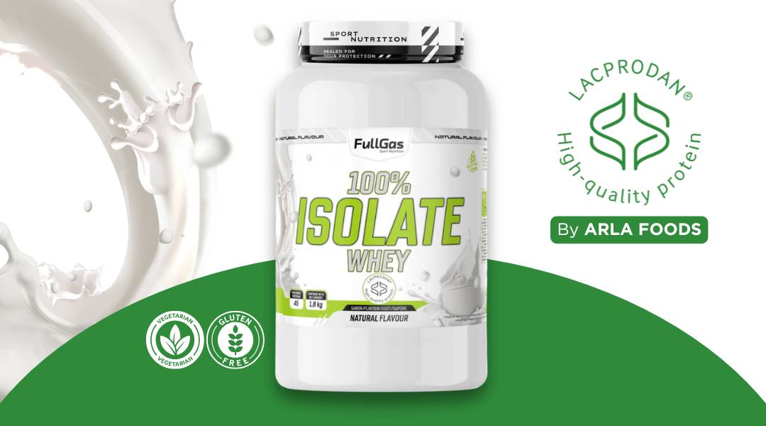 100% Isolate Whey de FullGas es un aislado de proteína de suero de leche formulado con la materia prima Lacprodan® SP-9225 (Arla Foods).