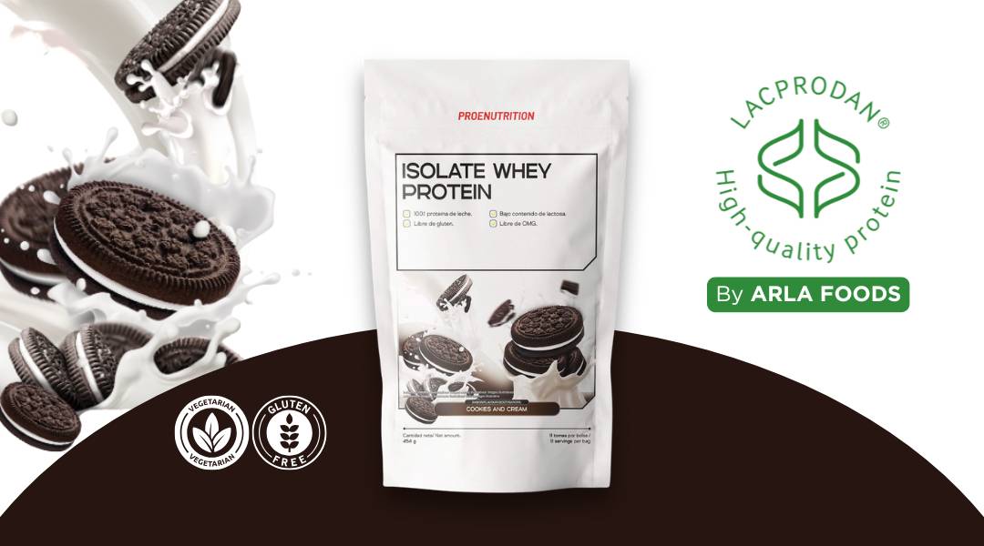 Aislado de proteína de suero con materia prima Lacprodan® SP-9225 (Arla Foods). Alto contenido en proteínas, fácil disolución, sin azúcares añadidos, bajo en grasa, sin gluten y sin amino spiking
