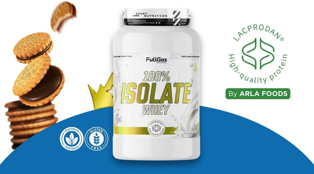 100% Isolate Whey de FullGas es un aislado de proteína de suero de leche formulado con la materia prima Lacprodan® SP-9225 (Arla Foods).