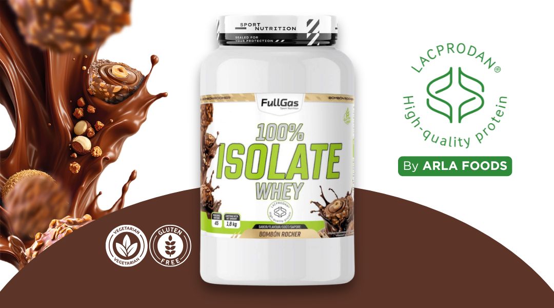 100% Isolate Whey de FullGas es un aislado de proteína de suero de leche formulado con la materia prima Lacprodan® SP-9225 (Arla Foods).