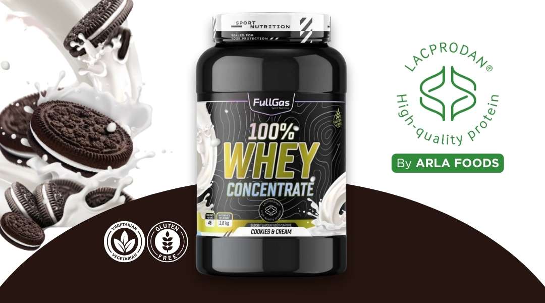 100% Whey Protein de FullGas es un concentrado de proteína de suero de leche formulado con la materia prima Lacprodan® SP-8011 (Arla Foods).