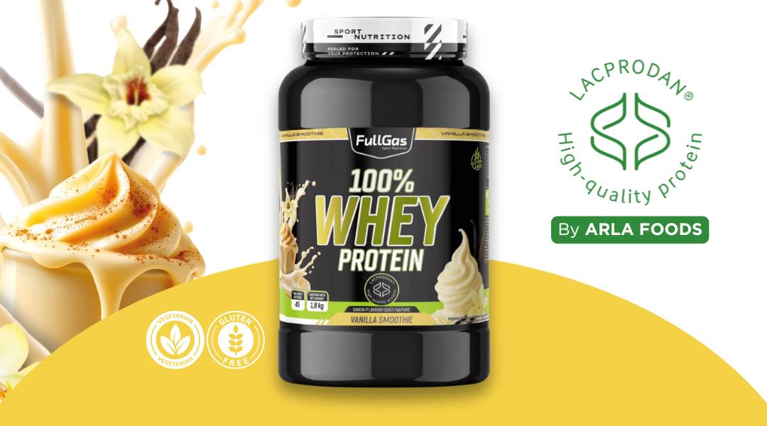 100% Whey Protein de FullGas es un concentrado de proteína de suero de leche formulado con la materia prima Lacprodan® SP-8011 (Arla Foods).