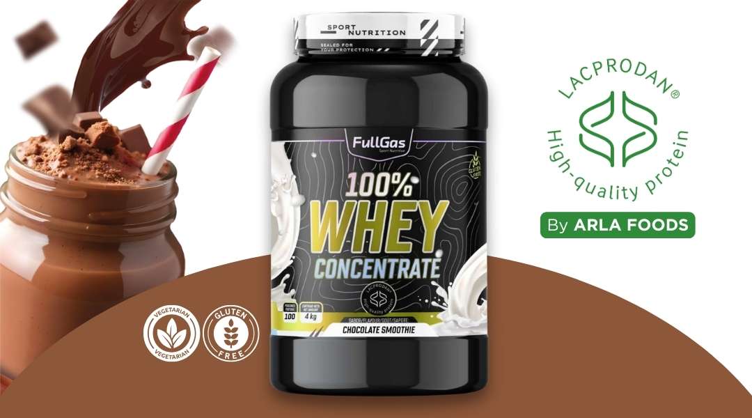 100% Whey Protein de FullGas es un concentrado de proteína de suero de leche formulado con la materia prima Lacprodan® SP-8011 (Arla Foods).