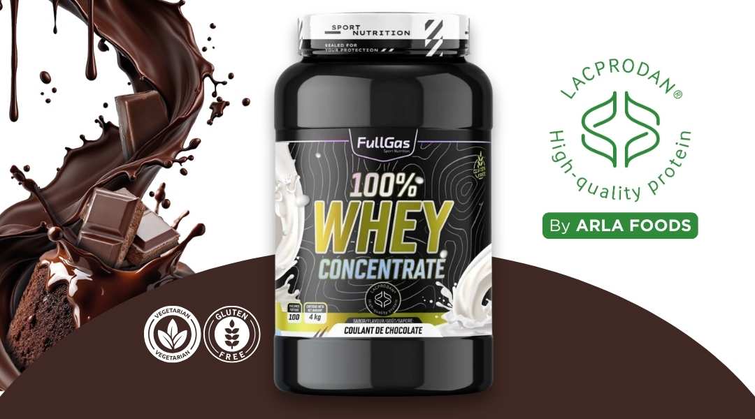 100% Whey Protein de FullGas es un concentrado de proteína de suero de leche formulado con la materia prima Lacprodan® SP-8011 (Arla Foods).