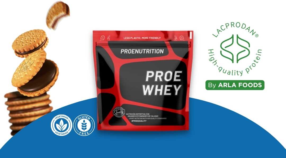 Concentrado de proteína de suero con materia prima Lacprodan® SP-8011 (Arla Foods). Alto contenido en proteínas, fácil disolución, sin azúcar añadido, sin gluten, 100% vegetariano y sin amino spiking