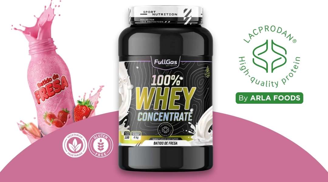 100% Whey Protein de FullGas es un concentrado de proteína de suero de leche formulado con la materia prima Lacprodan® SP-8011 (Arla Foods).