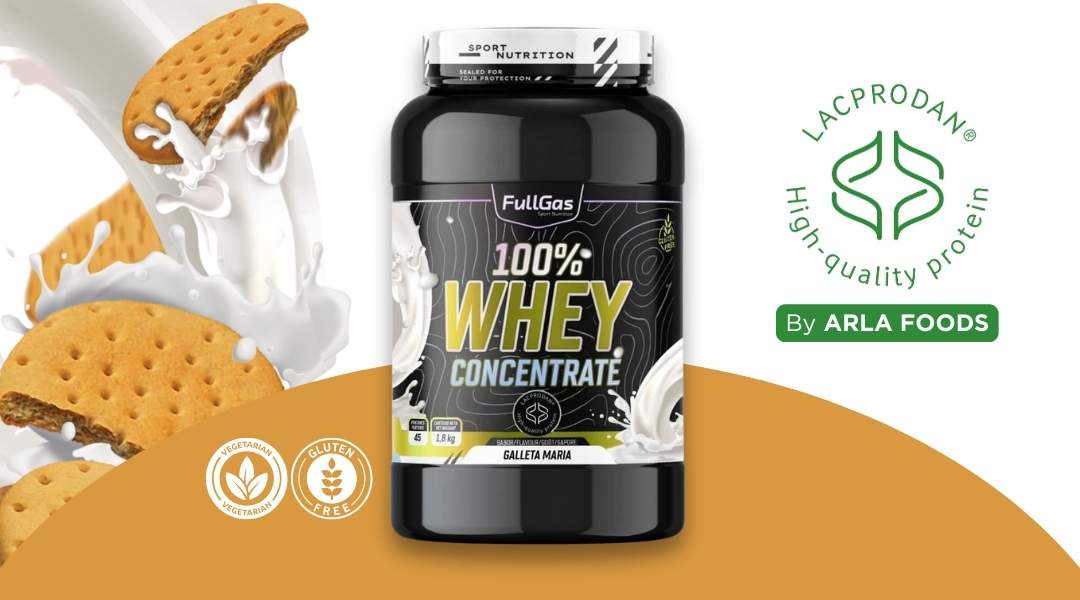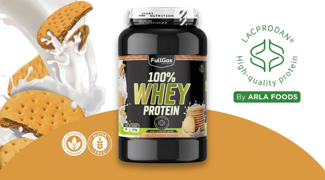 100% Whey Protein de FullGas es un concentrado de proteína de suero de leche formulado con la materia prima Lacprodan® SP-8011 (Arla Foods).