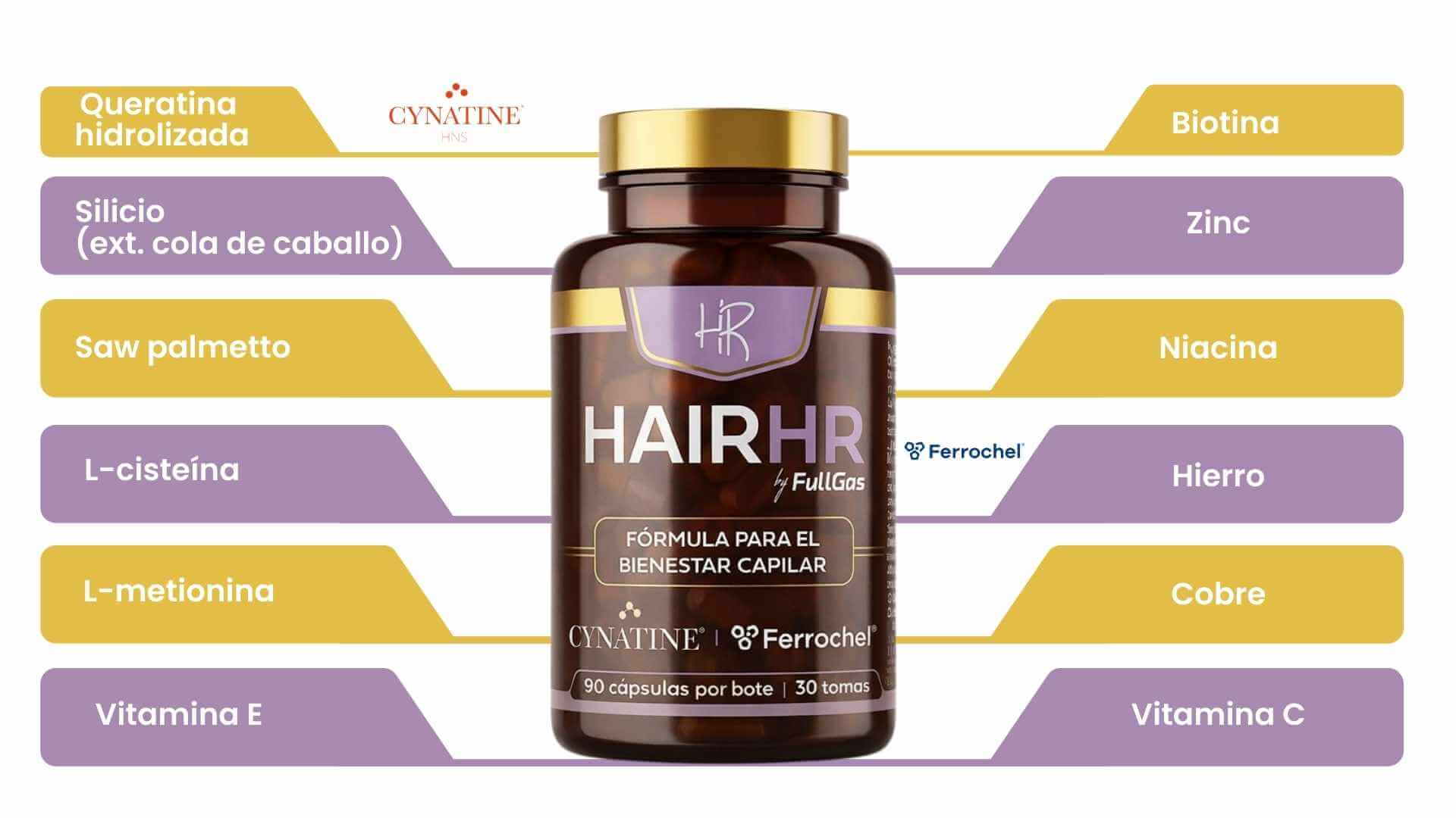 HairHR es un complemento alimenticio formulado con 12 ingredientes como queratina hidrolizada, silicio (procedente de extracto de cola de caballo), saw palmetto (Serenoa repens), aminoácidos azufrados (cisteína y metionina), zinc, hierro, cobre, vitamina C, biotina, niacina y vitamina E. Su composición ha sido desarrollada por la farmacéutica Helena Rodero, y está pensada para apoyar el bienestar capilar en mujeres y hombres.