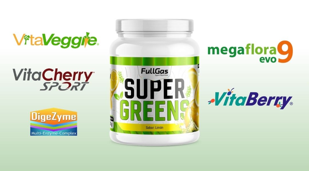 Fórmula completa de greens (extractos y concentrados vegetales). Contiene verduras VitaVeggie®, frutas VitaBerry®, enzimas DigeZyme®, beta-glucanos, probiótico Megaflora 9 evo, VitaCherry® Sport y espirulina. 100% vegano y sin edulcorantes.