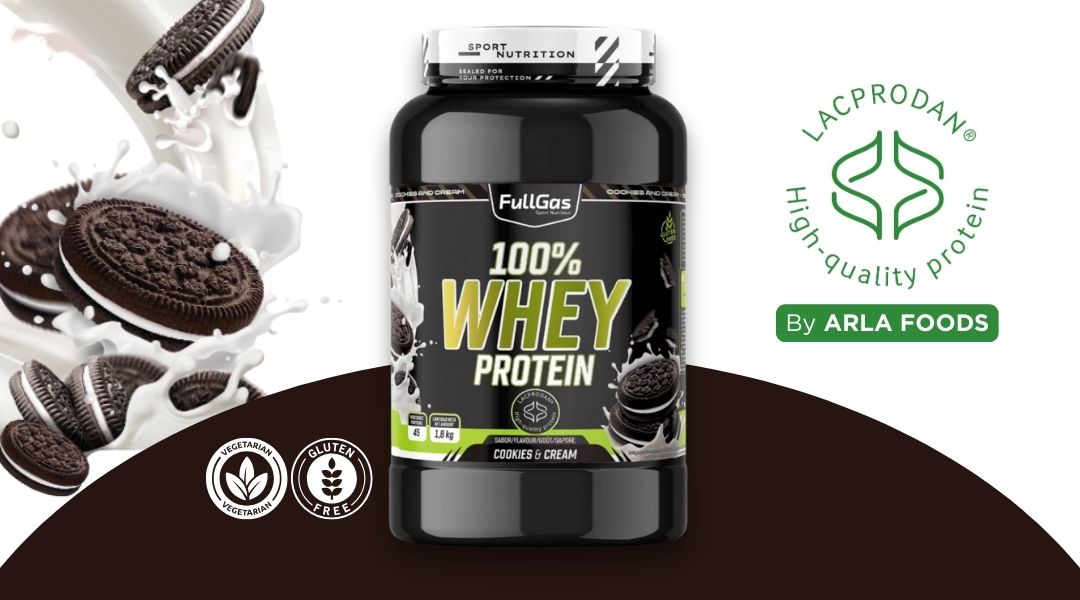 100 % Whey Protein de FullGas est un concentré de protéine de lactosérum, formulé à partir de la matière première Lacprodan® SP-8011 (Arla Foods).